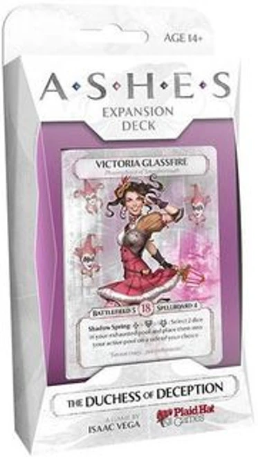 Ashes: The Duchess of Deception, which features new Phoenixborn Victoria Glassfire, is a full, ready-to-play Ashes expansion deck including two conjurations. Victoria requires ten Illusion (purple) dice to play, which are included in the Ashes: Rise of the Phoenixborn base set.
