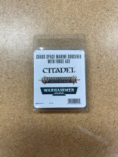 This kit builds one Chaos Space Marines Sorcerer armed with Force Axe. The model comes supplied with a Citadel 40mm Round Base.