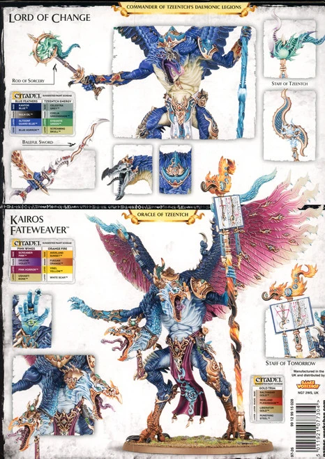 This multi-part plastic kit contains the components necessary to assemble Kairos Fateweaver . The kit features an impressive amount of customization, with 2 different heads and his own wing tip decorations (the wings themselves can be modelled in 2 different positions.)