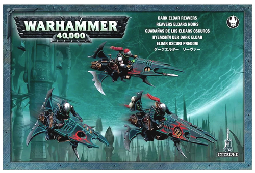 This box set contains three multi-part plastic Drukhari Reavers. This 68-piece set includes: seven heads and three different bodies, a heat lance, a blaster, a cluster caltrop pod and a host of extra blades. Models supplied with small flying bases.