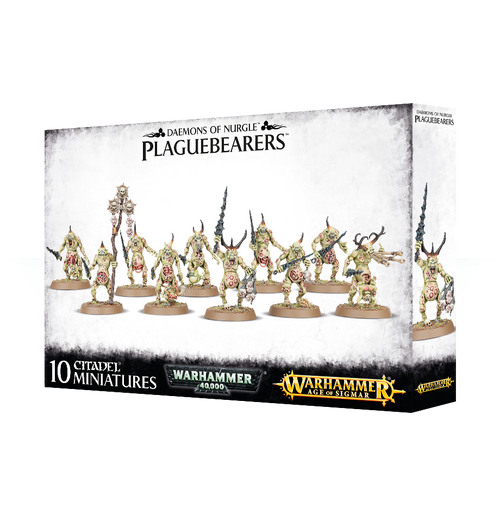 This multi-part plastic kit contains the 74 components, with which to make 10 Plaguebearers of Nurgle. The kit contains enough components to assemble a command group, including a Herald of Nurgle, a musician and a standard bearer. Supplied with 10 Citadel 32mm Round bases.