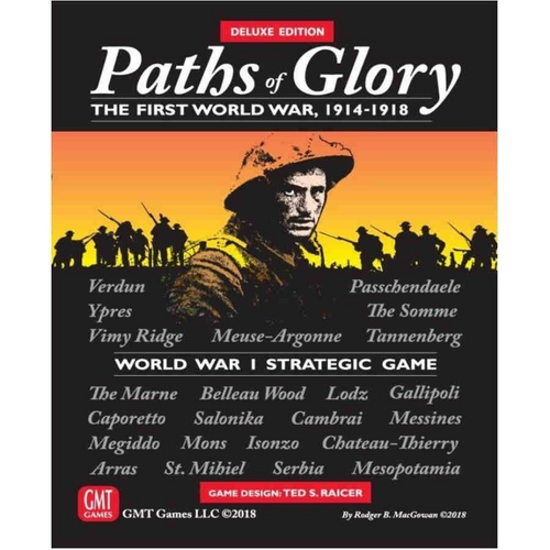 Paths of Glory: The First World War, designed by six-time Charles S. Roberts Award winner, Ted Raicer, allows players to step into the shoes of the monarchs and marshals who triumphed and bungled from 1914 to 1918. As the Central Powers you must use the advantage of interior lines and the fighting skill of the Imperial German Army to win your rightful ”place in the sun.” As the Entente Powers (Allies) you must bring your greater numbers to bear to put an end to German militarism and ensure this is the war ”to end all wars.” Both players will find their generalship and strategic abilities put to the test as Paths of Glory’s innovative game systems let you recreate all the dramatic events of World War I.