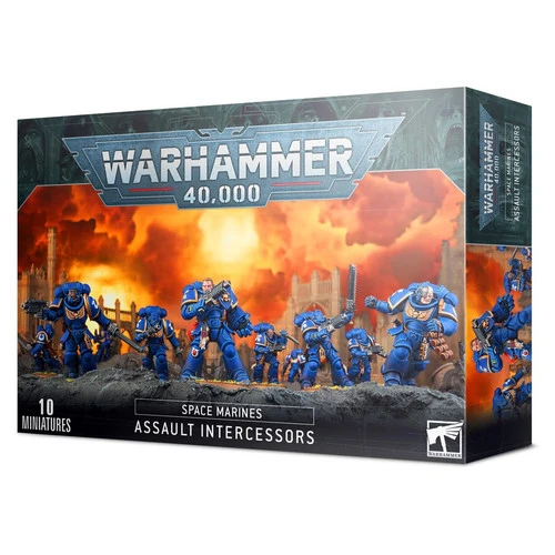 This multipart plastic kit contains the components necessary to assemble a set of 10 Assault Intercessors. The models can be assembled as either a 10-man squad, a squad of 9 Assault Intercessors with a Sergeant or 2 separate 5-man squads, each with a Sergeant of their own. They are each armed with an Astartes chainsword and heavy bolt pistol.