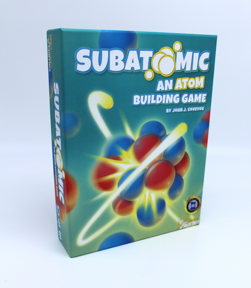 Subatomic is a deck‐building game where players use their starting deck of photons and quarks to create protons, neutrons, and electrons. Players then use those subatomic particles to buy more powerful cards for their deck or construct elements to score points!