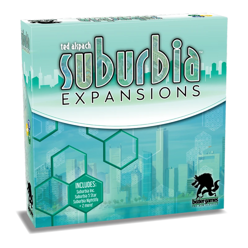 Suburbia: Expansions contains three large expansions for Suburbia that were originally released independently — Suburbia Inc., Suburbia 5★, and Suburbia Nightlife — as well as two smaller expansions: Essen and Cons. These expansions can be used with Suburbia one at a time, in any mixture, or all at once!
