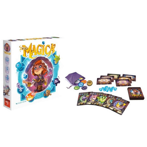 In Via Magica, a new version of Rise of Augustus, you vie with your fellow players to complete “objective” cards for special powers and ultimately for victory points. Each card has 2-6 symbols which you must populate with tokens in order to complete the card. These symbols are drawn one at a time from a bag, with all players gaining the benefit equally, but interestingly, the bag contains more of some symbols than others.
